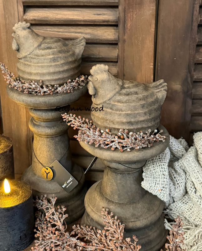 Laat de kip extra tot haar recht komen door haar te combineren met natuurlijke materialen zoals een houten schaal, wat mos of een linnen doek. Zo ontstaat een rustig geheel met karakter, perfect voor elk seizoen.